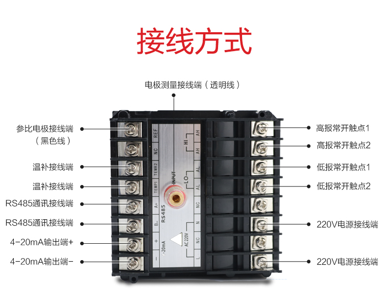 - 具備PH/ORP測量、溫度測量、上下限控制、變送輸出、RS485通訊功能